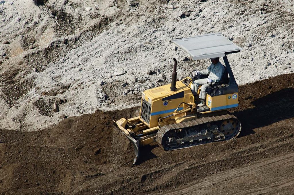 止まったブルドーザーと「ボタ」の山
